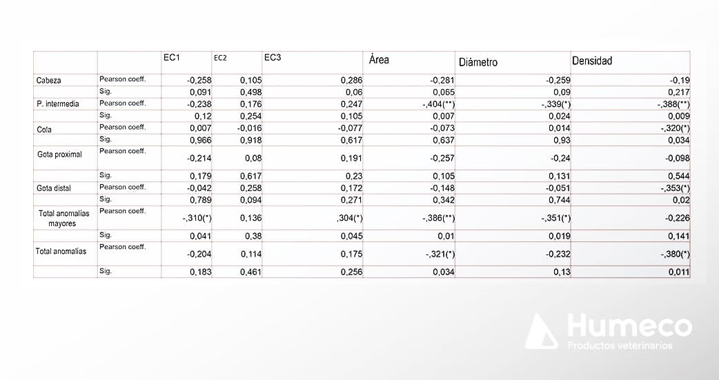 La correlación de Pearson mostró una correlación significativa moderada con todos los parámetros de ecotextura (excepto EC2) y el porcentaje de morfoanomalías primarias (p <0.01). Lo mismo ocurrió con el porcentaje de espermatozoides anormales totales.