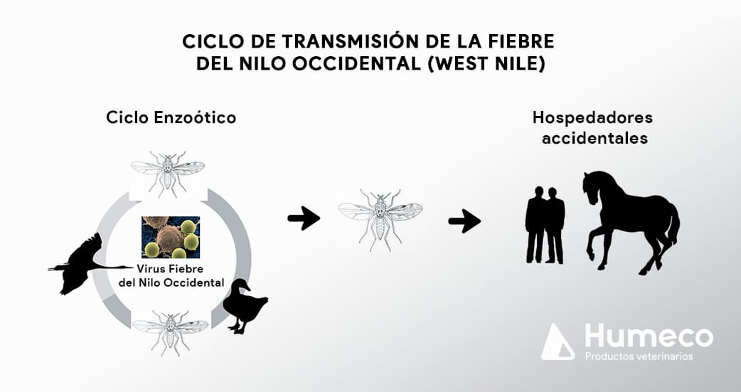 El mosquito infectado puede transmitir la enfermedad a équidos (especialmente caballos), aunque también es posible la transmisión a personas. Los mosquitos no se infectan al picar a los caballos, ni se transmite entre caballos y personas.