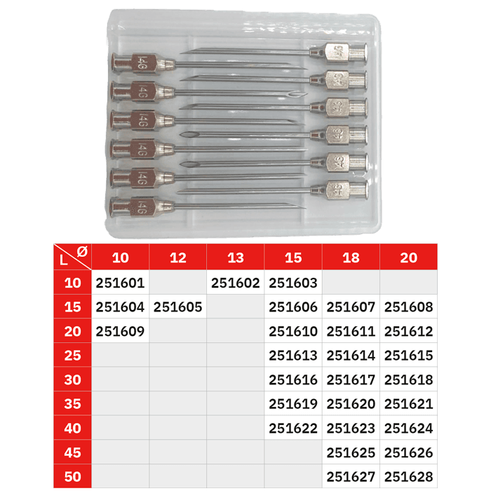 Las Hipodérmicas de Agujas, 25 x 18 mm, son un conjunto de 12 agujas hipodérmicas premium de grado médico. Hecho de acero inoxidable de alta calidad, estas agujas cuentan con un cubo de bronce chapado en cromo y un eje redondo, lo que garantiza una durabilidad y precisión óptimas en los procedimientos veterinarios.