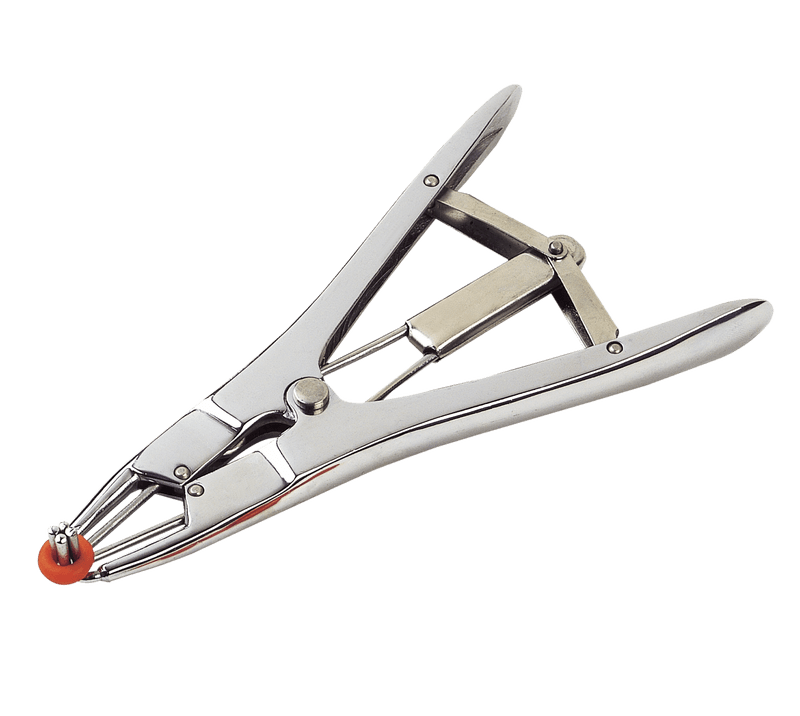 - Esta tenaza se acciona por un mecanismo a presión y la punta que está adaptada al tamaño de las gomas de caucho para colocar cómodamente en el animal