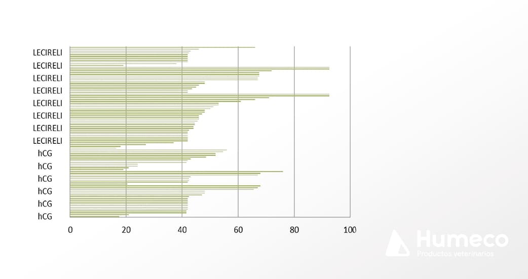 Una vez que se detectó el estro y la presencia de un folículo preovulatorio (≥35 mm de diámetro en la ecografía), se inyectaron aleatoriamente un total de 95 yeguas PRE con 2500 u.i de hCG (Veterin Corion, Divasa) (n=38) o 100 μgr de lecirelina (Dalmarelin, Fatro) (n=57)