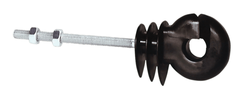 - Aislador para cercados eléctricos con sistema de fijación especialmente diseñado para instalación en postes metálicos o de plástico que dispongan de orificio (o puedan perforarse) para pasar la varilla metálica