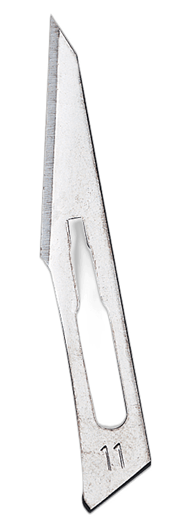 - Las hojas de bisturí número 11 presentan un borde recto que culmina en una punta de gran filo lo que permite realizar incisiones más precisas