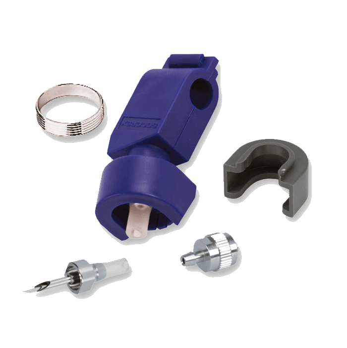 - Incluye un portavial, una aguja de alimentación, válvulas, rosca y arandela