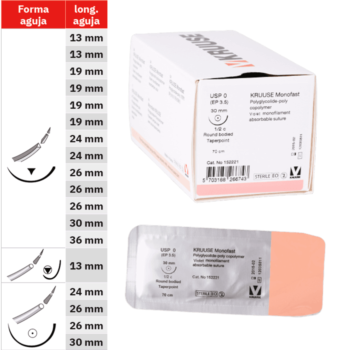 Monofast Kruuse es una sutura quirúrgica avanzada que se desintegra y se elimina del cuerpo sin la necesidad de extracción. Este producto está constituido por poliglicólido-poli (e-caprolactona) y copolímero (PGCL), que se someten a hidrólisis para garantizar un proceso de curación rápido y eficiente. La sutura presenta una forma circular, triangular invertida, con una longitud de aguja de 26 milímetros, un USP de 0 y un EP de 3.5. Cada sutura mide 70 centímetros de longitud y viene en un paquete de 18 unidades.