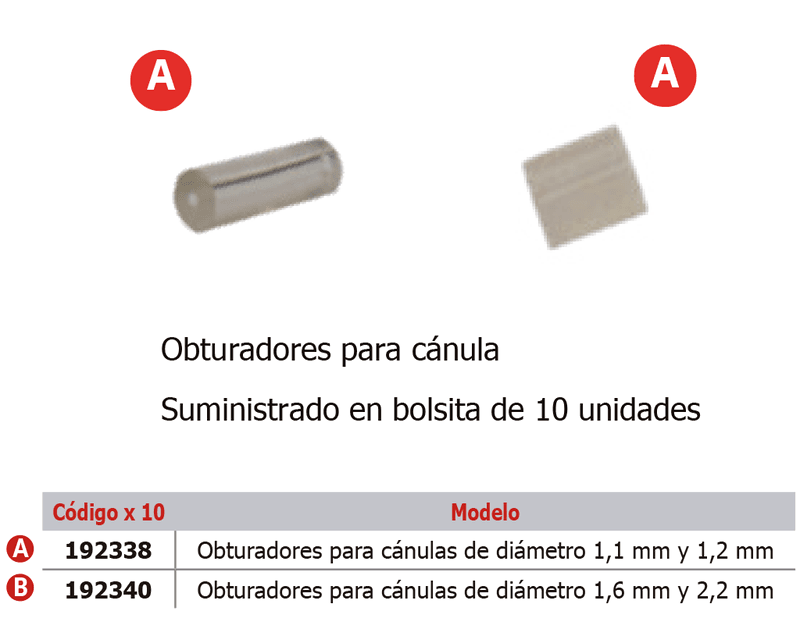 - Obturadores para cánulas de diámetro 1.1 milímetros y 1.2 milímetros
