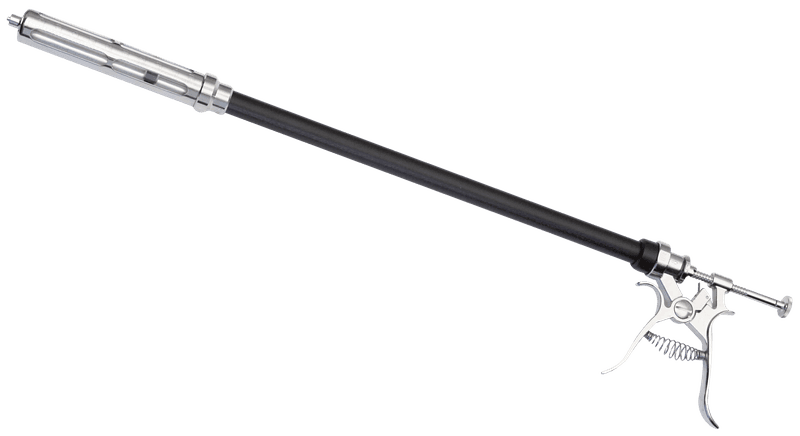 El Revólver Roux Con Alargadera es una jeringa veterinaria altamente eficiente diseñada con un extensor metálico resistente de 50 cm. Cuenta con un extensor rígido de aluminio robusto compatible con una jeringa Roux de 50 ml y un pistón ajustable para un control de dosis preciso. Con una longitud total de 65 centímetros, también incluye una rueda de dosificación precisa para una administración precisa de medicamentos. La jeringa viene con una salida de bloqueo Luer para conexiones seguras y sin fugas y es completamente desmontable para una fácil limpieza y mantenimiento.