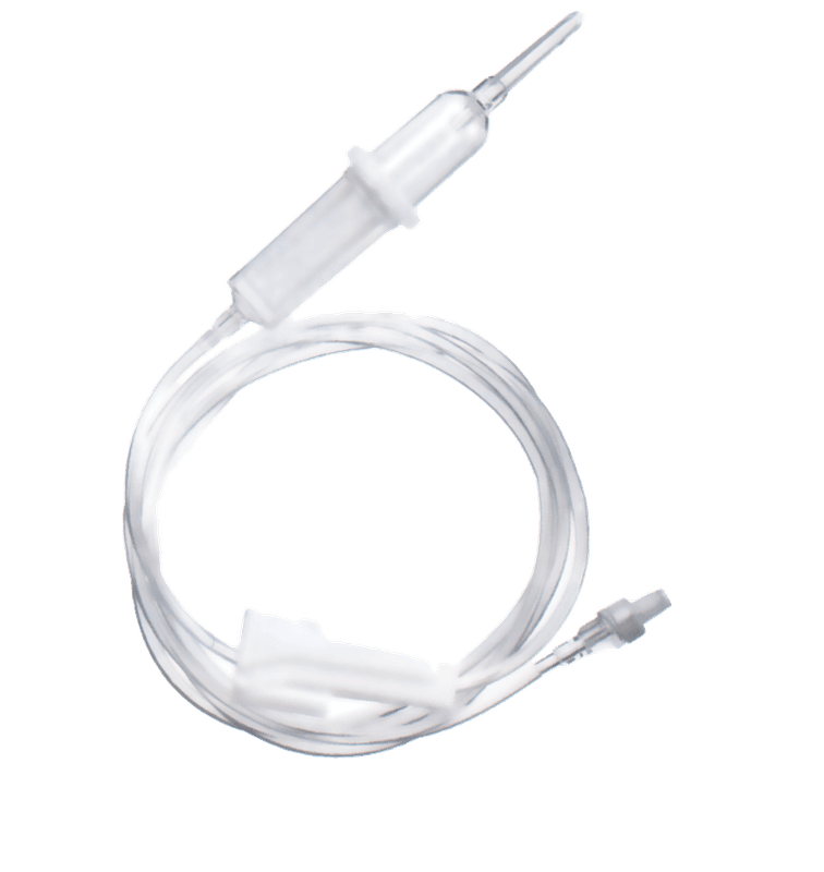 - Cámara de goteo transparente para control del flujo, regulador de goteo y clamp para su interrupción, zona de inyección flexible, conexión luer-lock